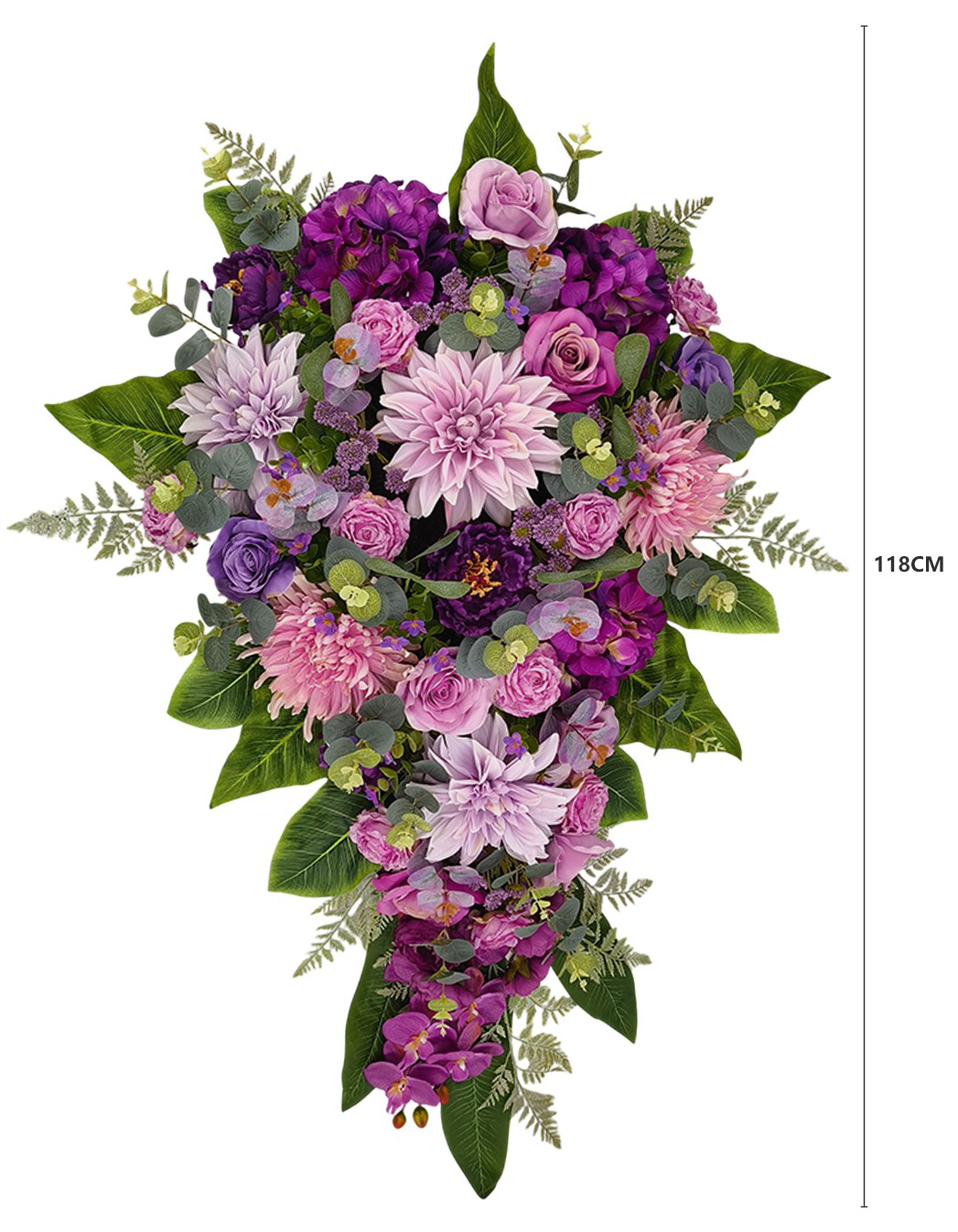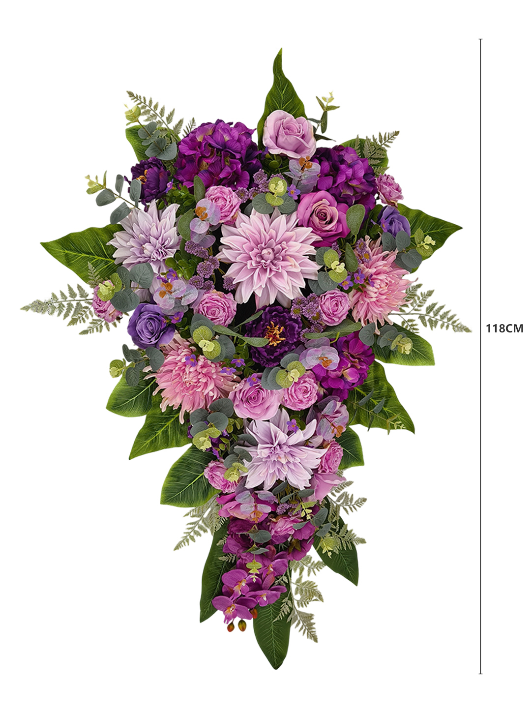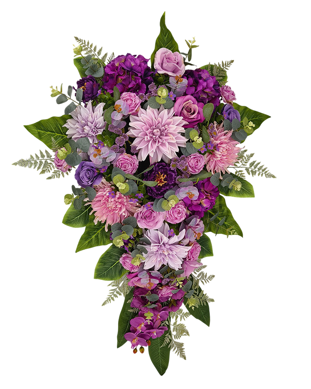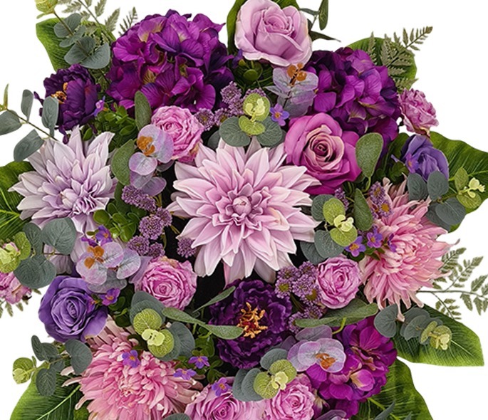 Duża kompozycja nagrobna premium o wymiarach 118 x 77 x 30 cm. Trwała dekoracja na grób, odporna na warunki atmosferyczne, z dołączoną złotą donicą z obciążeniem cementowym. W kompozycji znajdują się dalie, róże, hortensje, piwonie, chryzantemy, orchidee, eukaliptus, liście paproci i aspidistry. Model w odcieniach różu, purpury i fioletu.