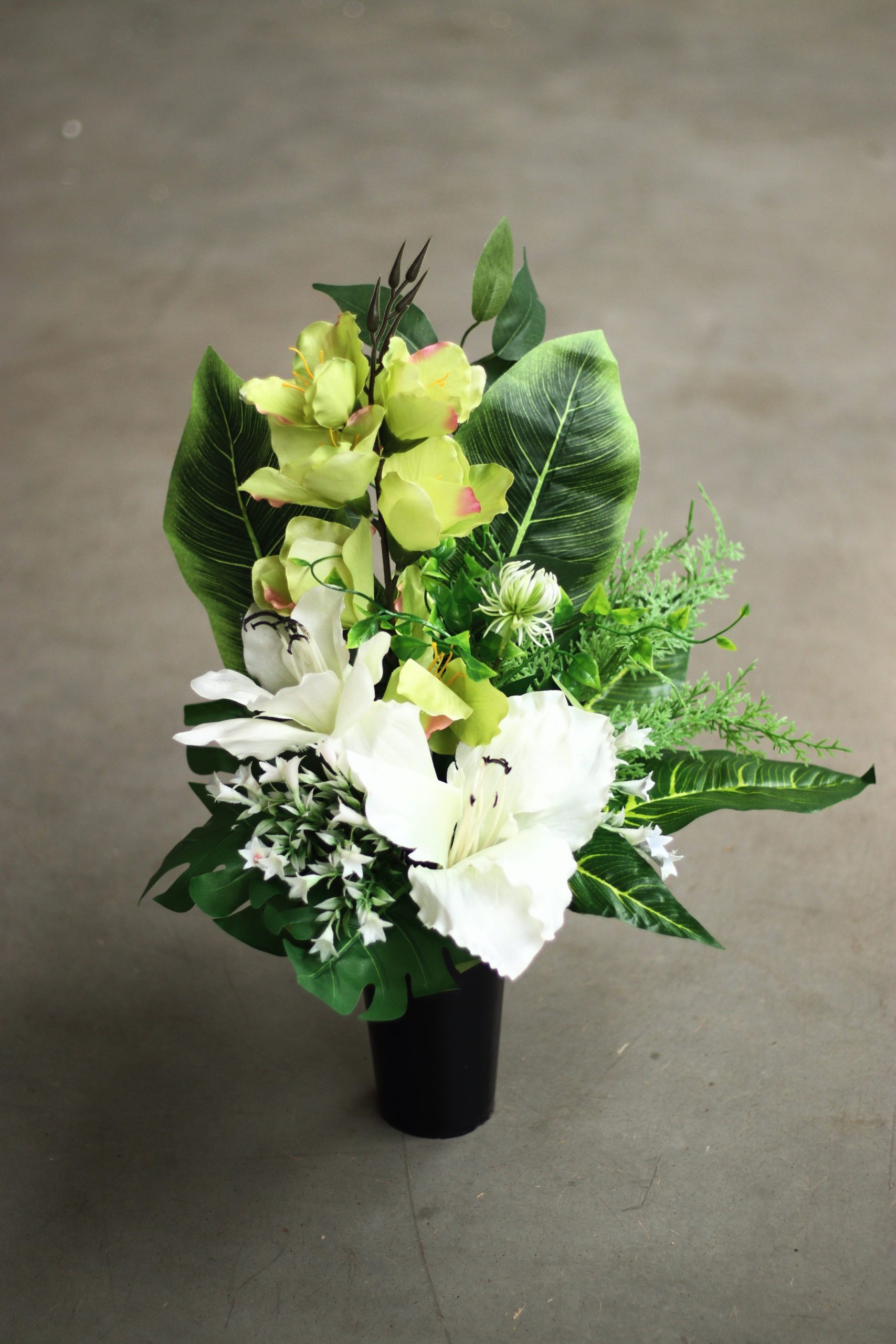 W komplecie wykorzystano lilie, róże, mieczyki oraz liście fikusa i diffenbachii. Oba elementy zostały przygotowane w tej samej stylistyce, dzięki czemu dobrze się uzupełniają i tworzą harmonijną całość. Kompozycja pozioma ma 84 cm długości, 46 cm szerokości i 29 cm wysokości, natomiast wiązanka do wazonu ma 56 cm wysokości i 40 cm szerokości. Taki zestaw sprawdzi się dla osób, które chcą estetycznie udekorować zarówno płytę nagrobka, jak i wazon ustawiony przy grobie.