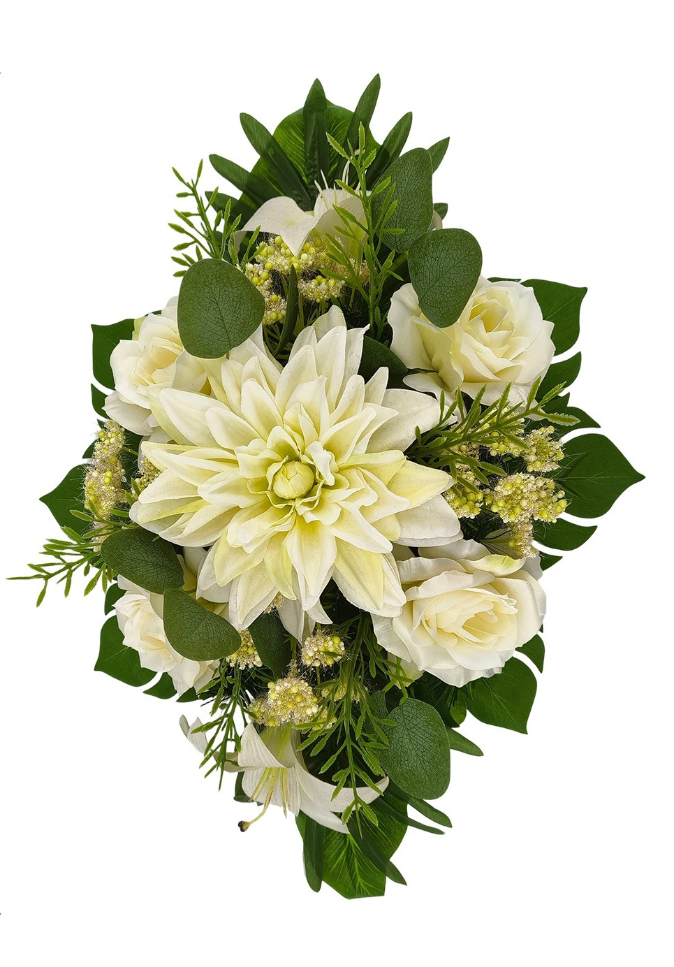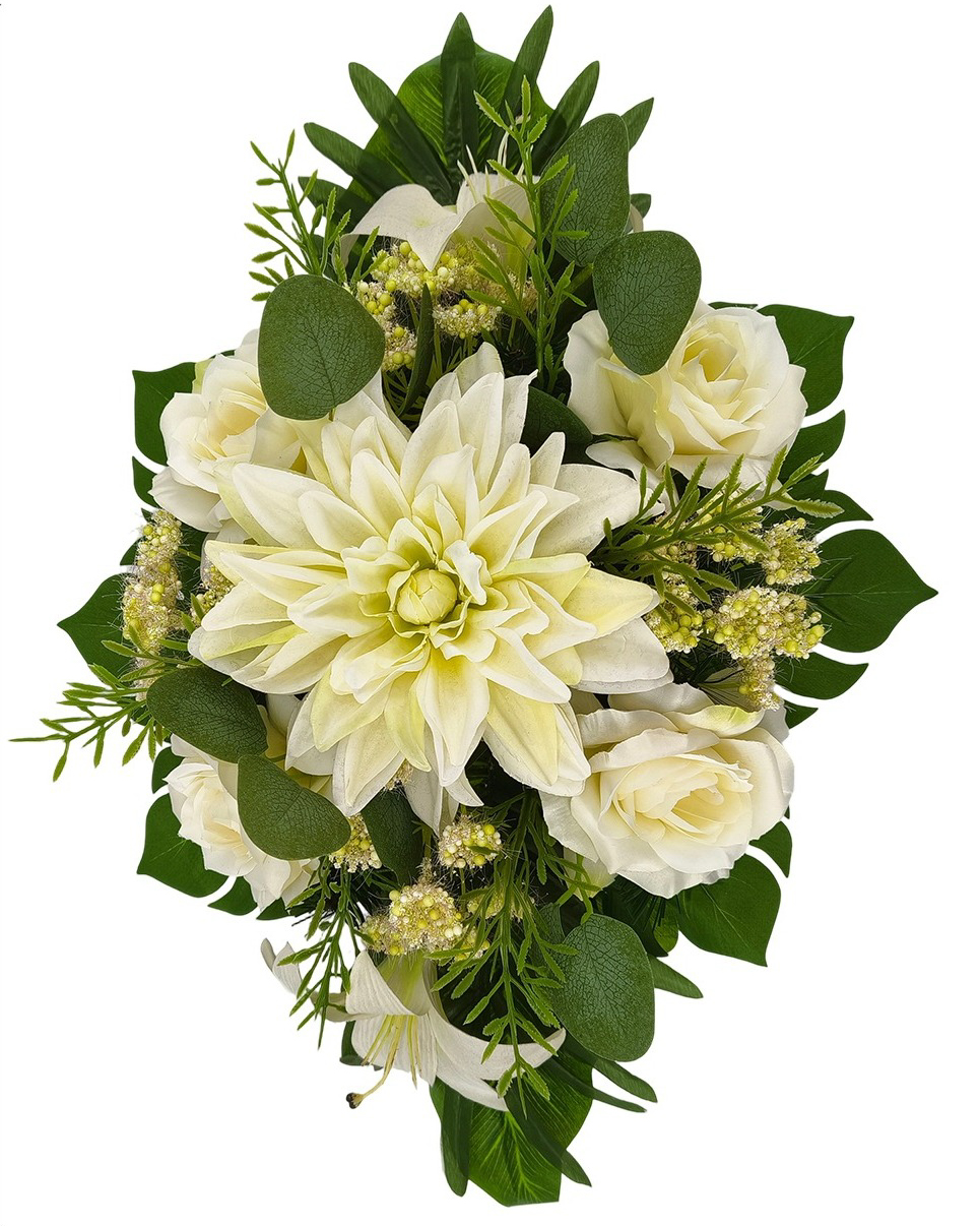 W kompozycji połączono kwiaty o zróżnicowanych kształtach i wielkościach. Centralnym punktem jest dalia, którą uzupełniają lilie, róże drobne kwiatki i liście ozdobne. Taki dobór elementów sprawia, że całość wygląda harmonijnie, a jednocześnie przyciąga uwagę starannym układem. Forma kompozycji jest wydłużona, dlatego dobrze wpisuje się w przestrzeń nagrobka.