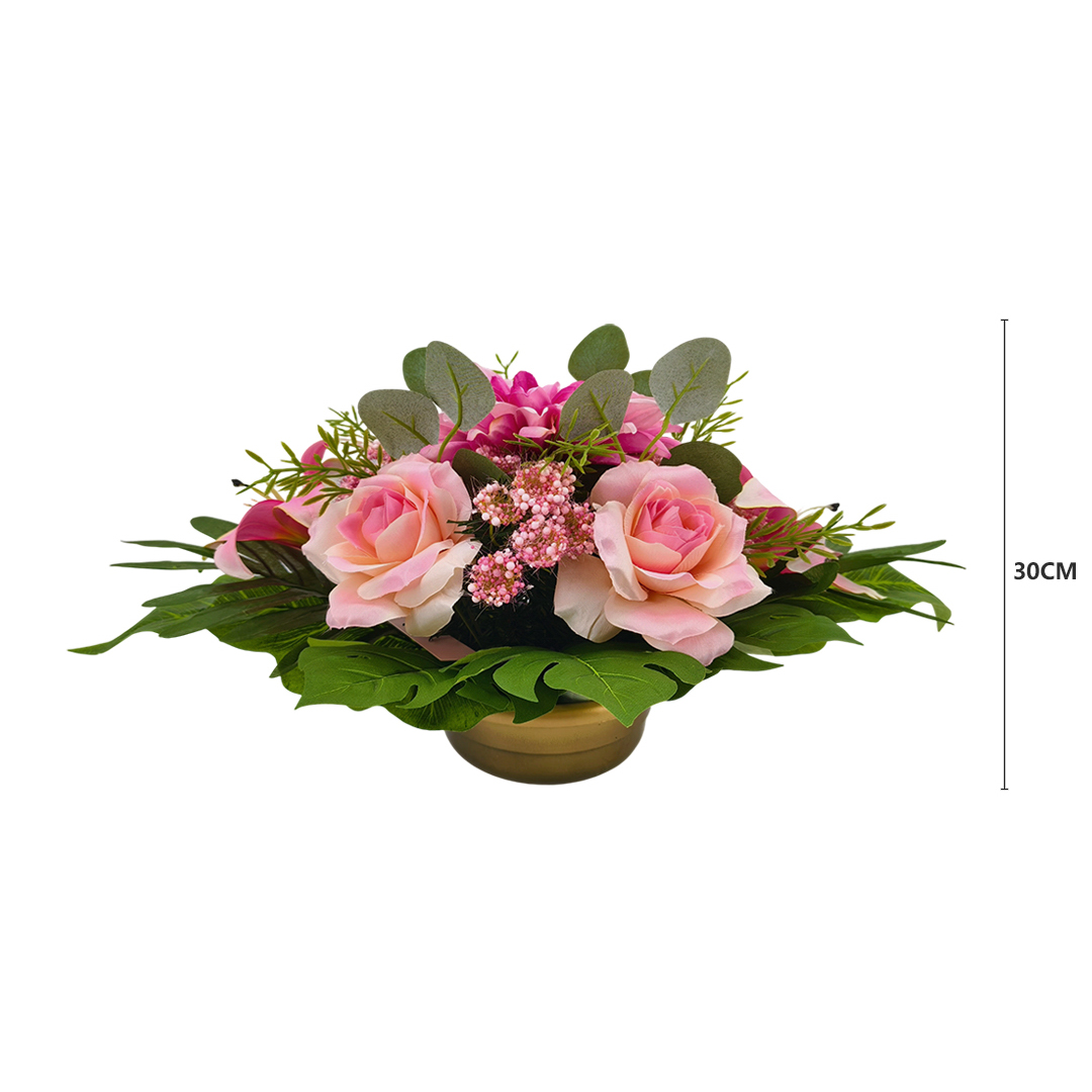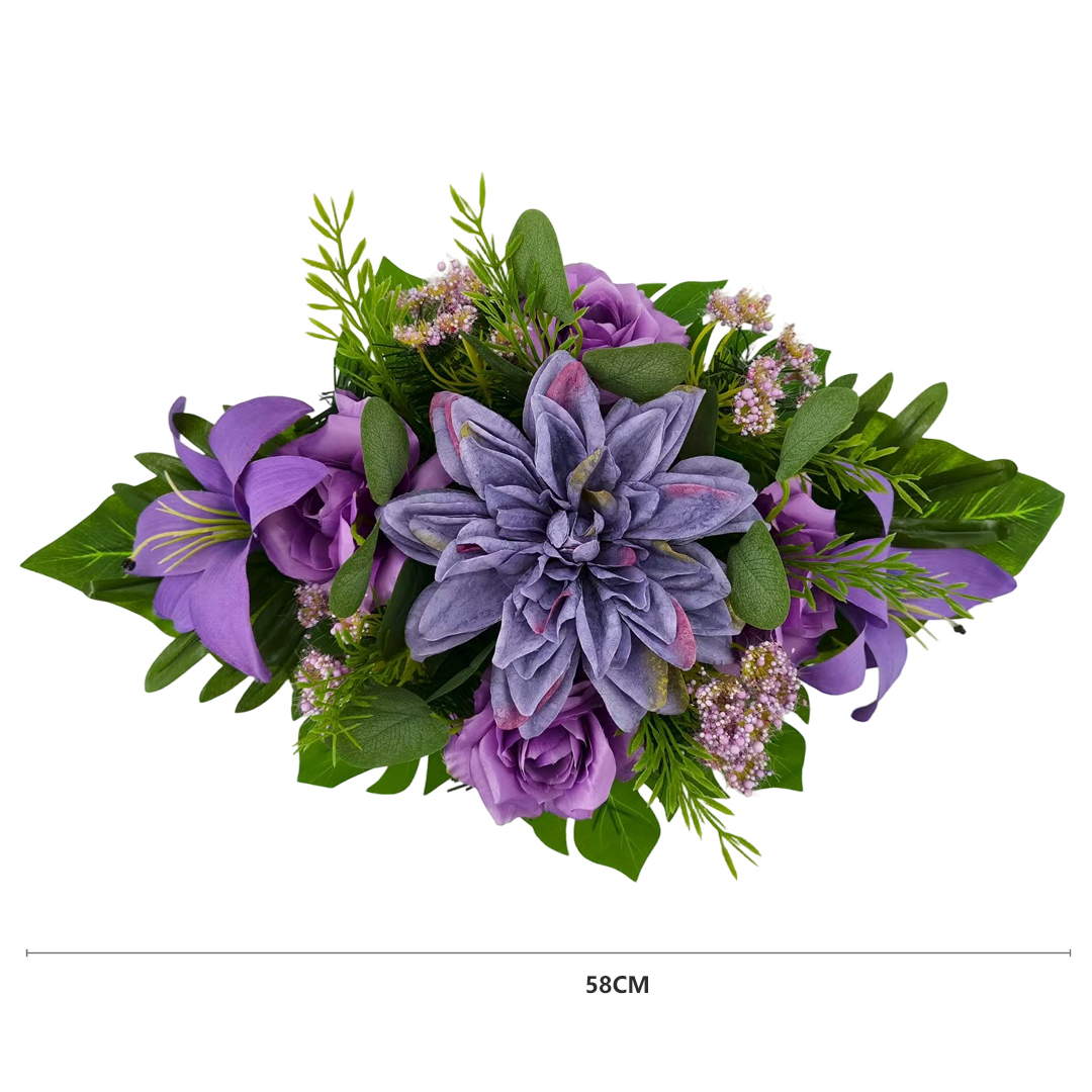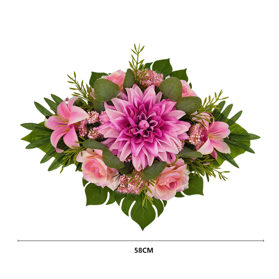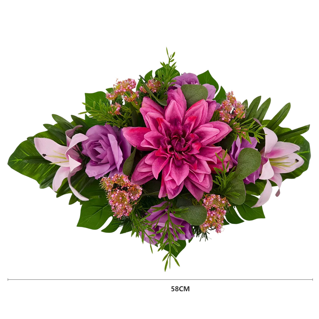 Kompozycja nagrobna z dalią, lilią i różą – 58 cm to propozycja dla osób, które szukają trwałej i estetycznej dekoracji na grób. Kompozycja została ułożona w donicy, dzięki czemu jest gotowa do ustawienia i dobrze prezentuje się na nagrobku zarówno na co dzień, jak i przy okazji świąt, czy rocznic.
