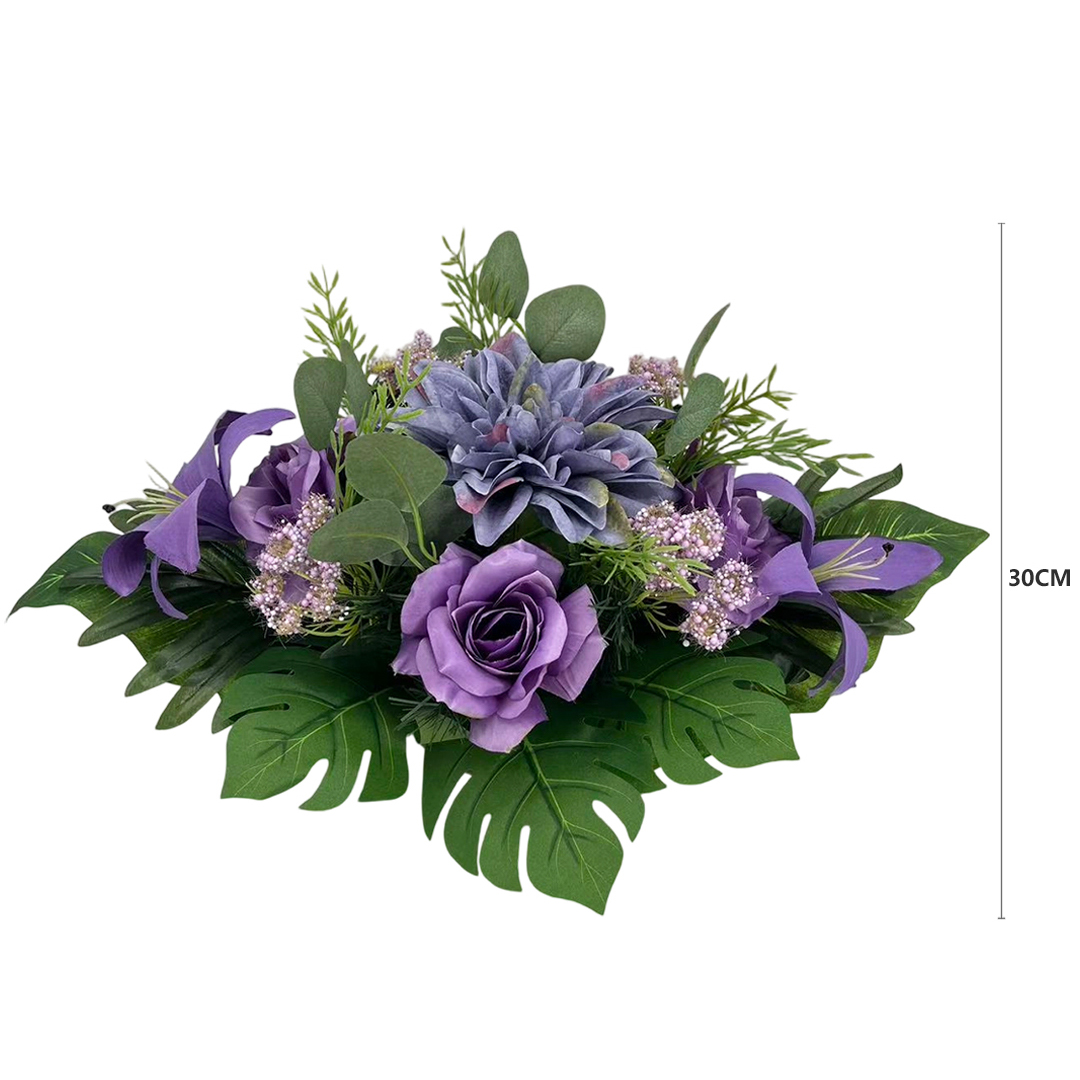 Model dostępny jest w czterech wariantach kolorystycznych: białym, różowym, purpurowym i fioletowym. Dzięki temu można dopasować kompozycję do charakteru i koloru pomnika, pory roku albo własnych preferencji. Kompozycja nagrobna z dalią, lilią i różą sprawdzi się jako dekoracja grobu bliskiej osoby wszędzie tam, gdzie liczy się spokojna forma, estetyka i trwałość.