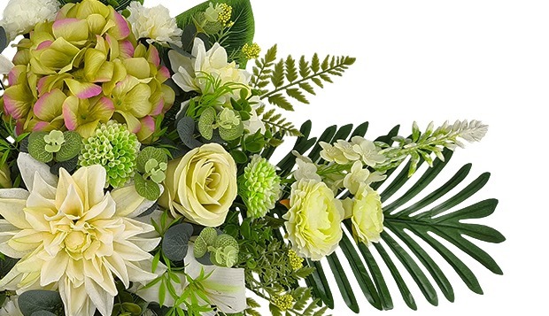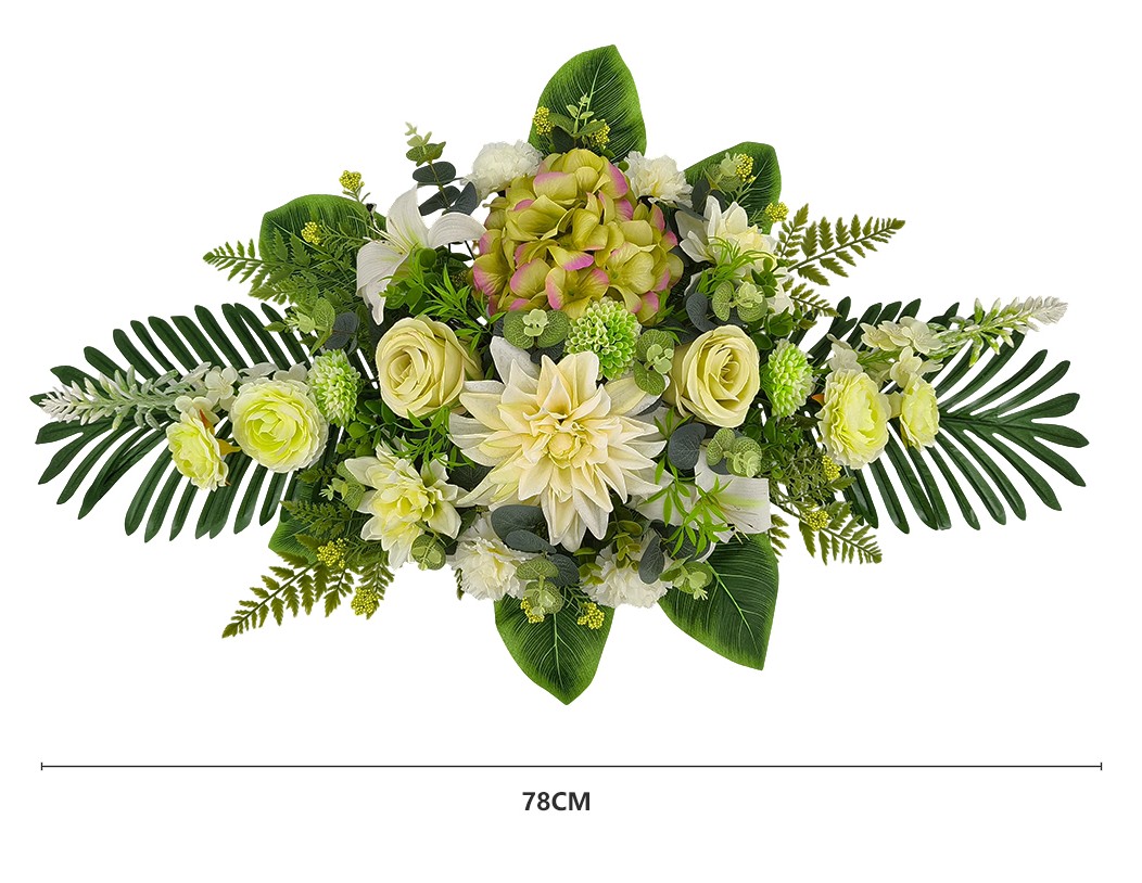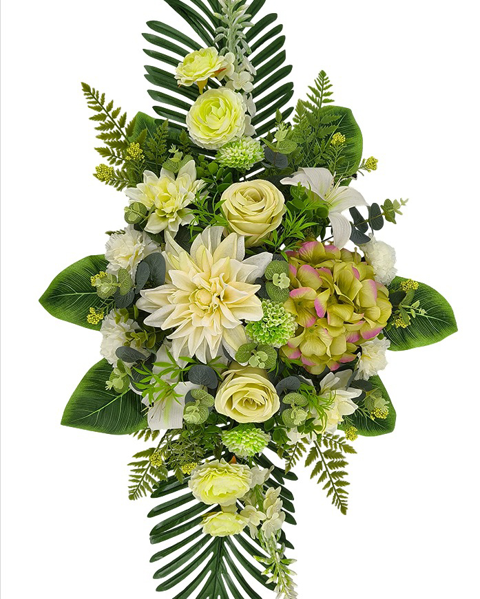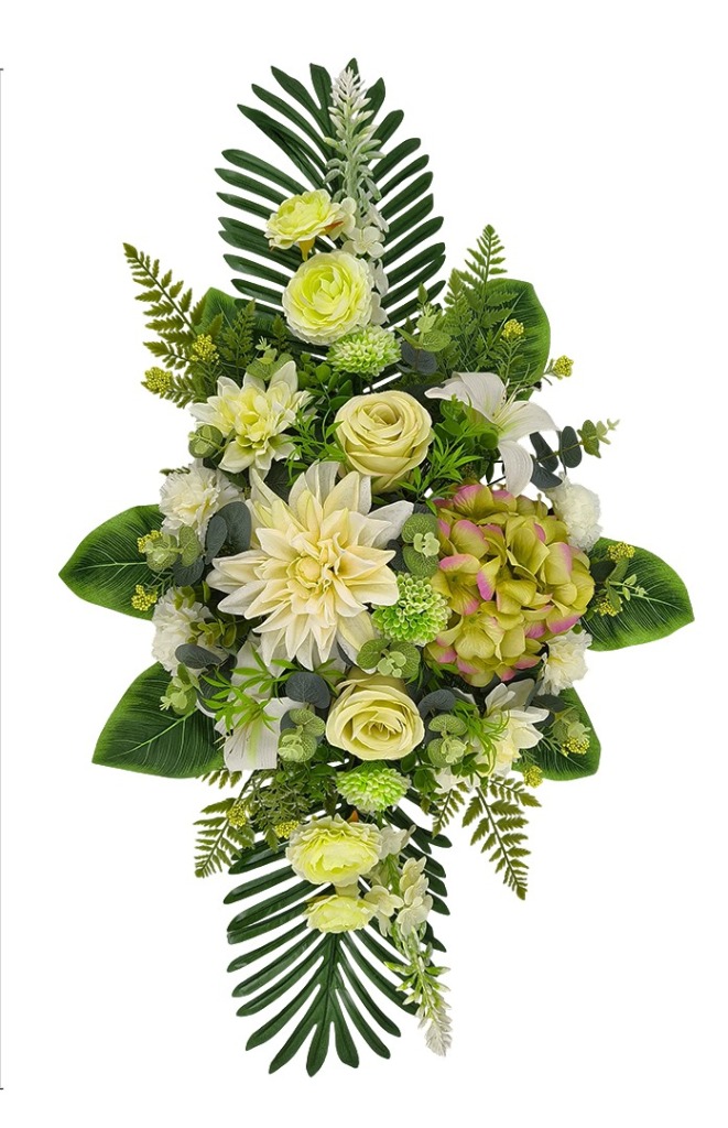 W kompozycji wykorzystano dalie, róże, hortensję, lilie, jaskry, goździki, dendrobium, gałązki eukaliptusa oraz liście paproci, palmy i aspidistry. Zestawienie różnych rodzajów kwiatów i liści sprawia, że całość wygląda naprawde okazale. Model zawiera 58 gałązek i 18 kwiatów, co przekłada się na gęsty, dopracowany układ. Biało-kremowa kolorystyka nadaje tej dekoracji spokojny, harmonijny charakter i dobrze komponuje się z różnymi typami nagrobków.