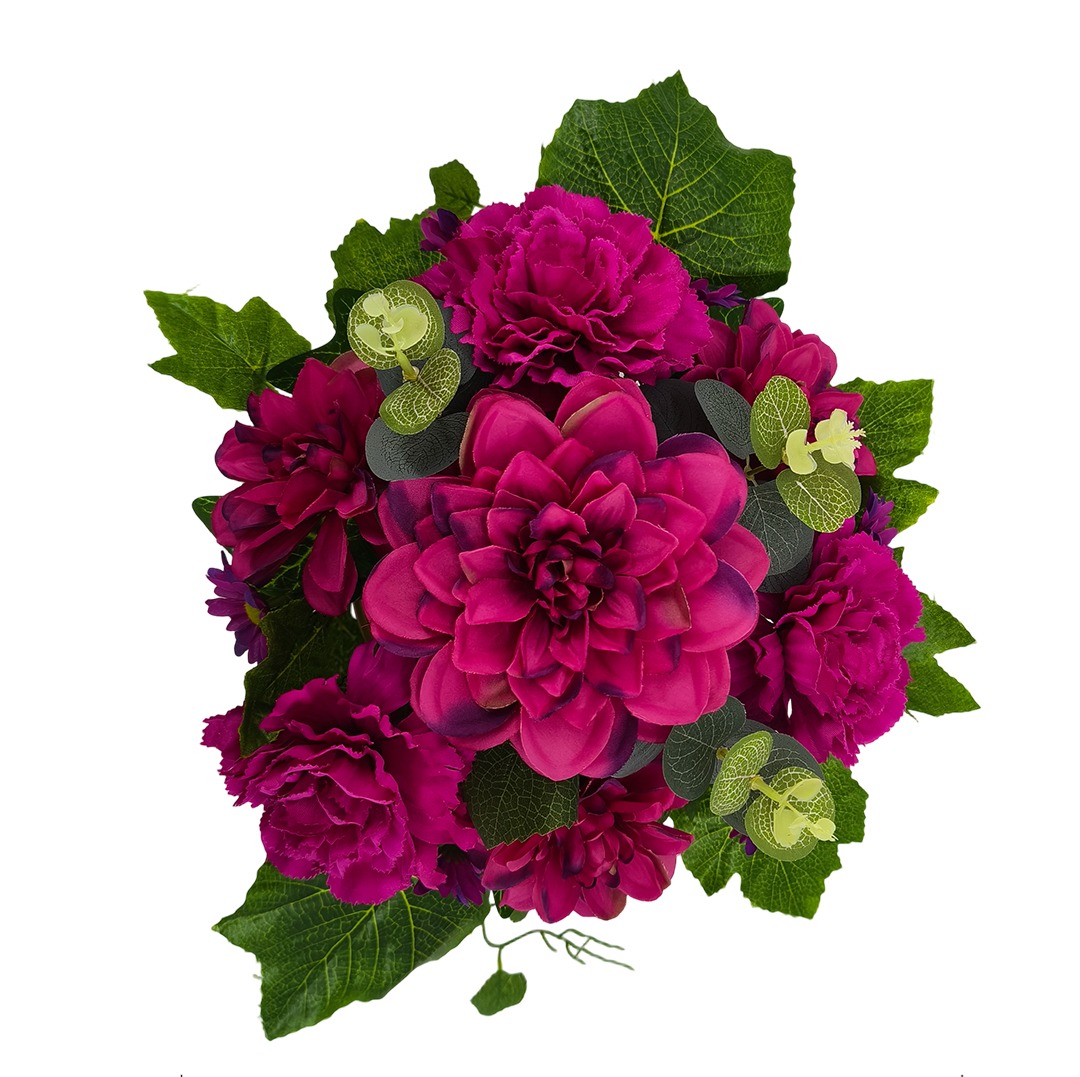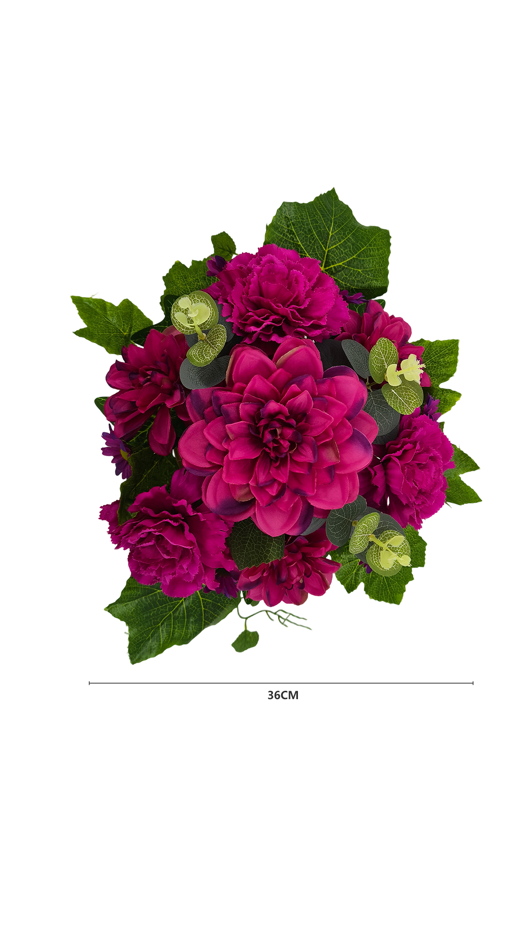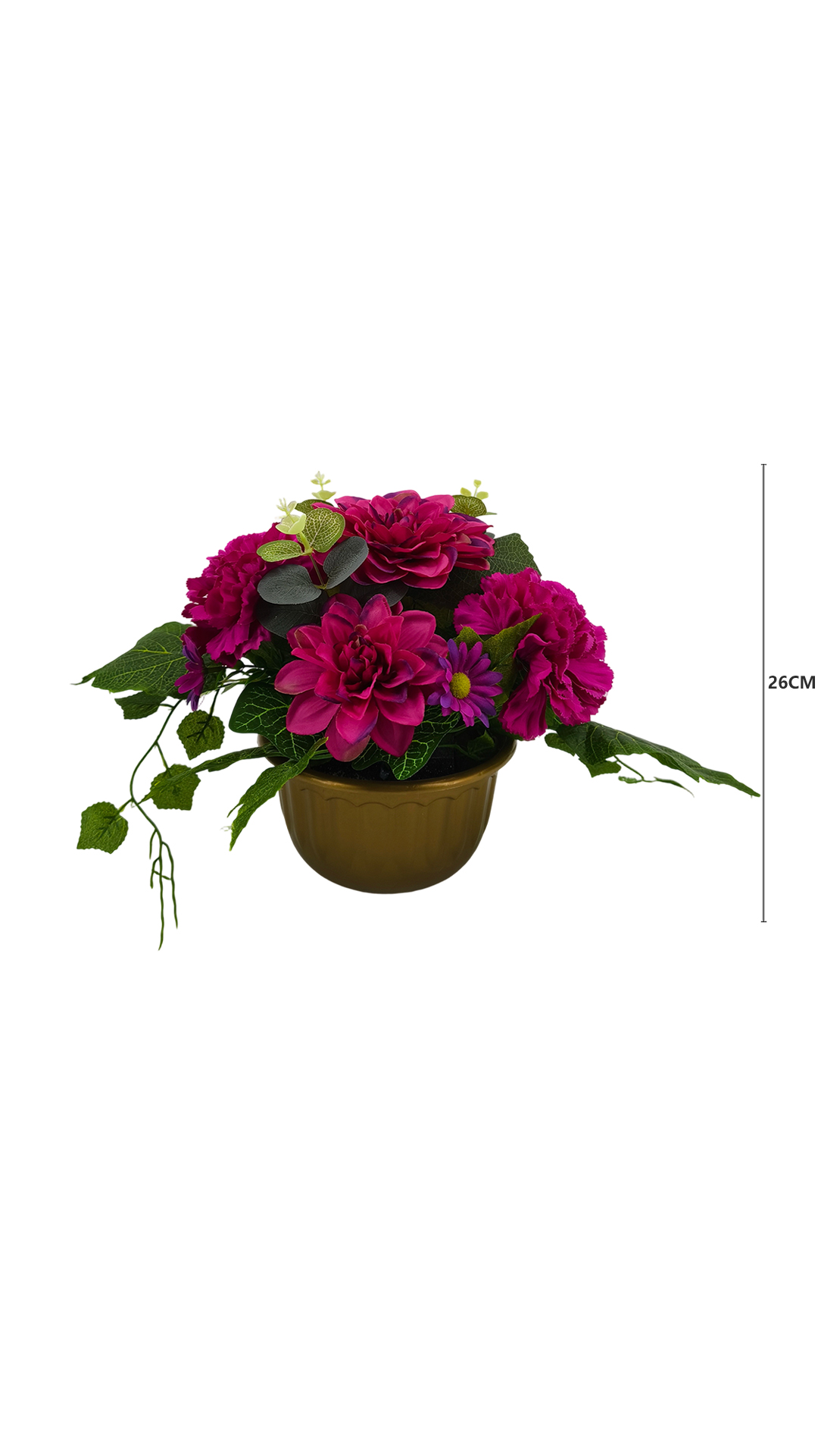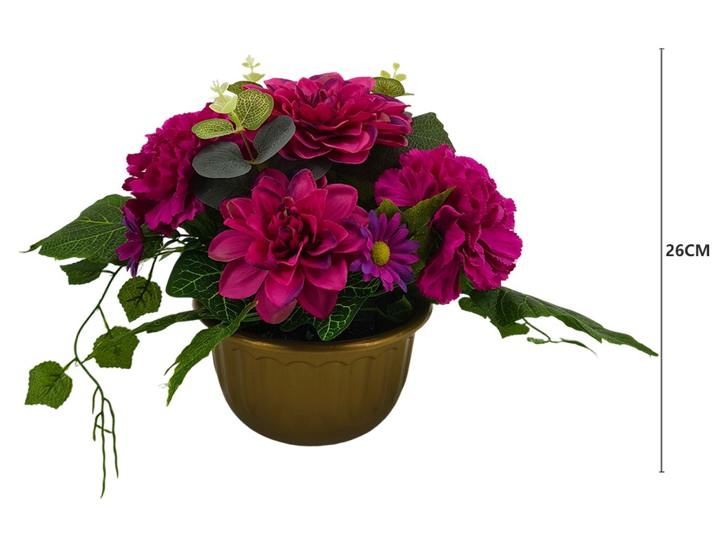 Ten model występuje w intensywnym purpurowym kolorze, który dobrze łączy się z zielenią liści i złotym wykończeniem donicy. To propozycja dla osób, które szukają trwałej dekoracji na cmentarz o bardziej wyrazistym charakterze. Kompozycja nagrobna z daliami w donicy łączy stabilność, trwałość i dopracowany wygląd.
