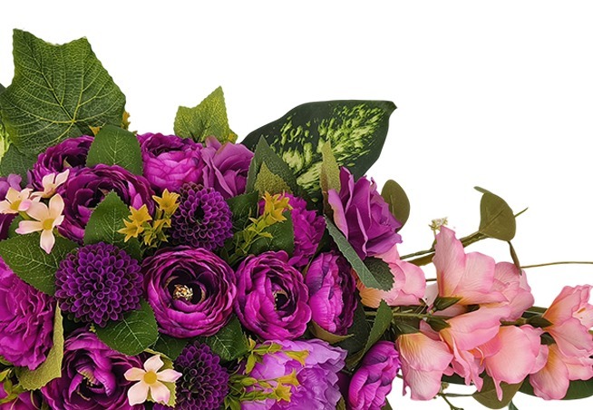W kompozycji wykorzystano jaskry, piwonie, róże, dalie, mieczyk, eukaliptus oraz liście diffenbachii. Zestawienie różnych rodzajów kwiatów i zielonych dodatków sprawia, że całość jest dobrze wypełniona. Model zawiera 38 gałązek i 20 kwiatów, co przekłada się na gęsty, dopracowany układ. Kolorystyka oparta na odcieniach fioletu, purpury i różu nadaje tej dekoracji wyrazisty, ale harmonijny wygląd.
