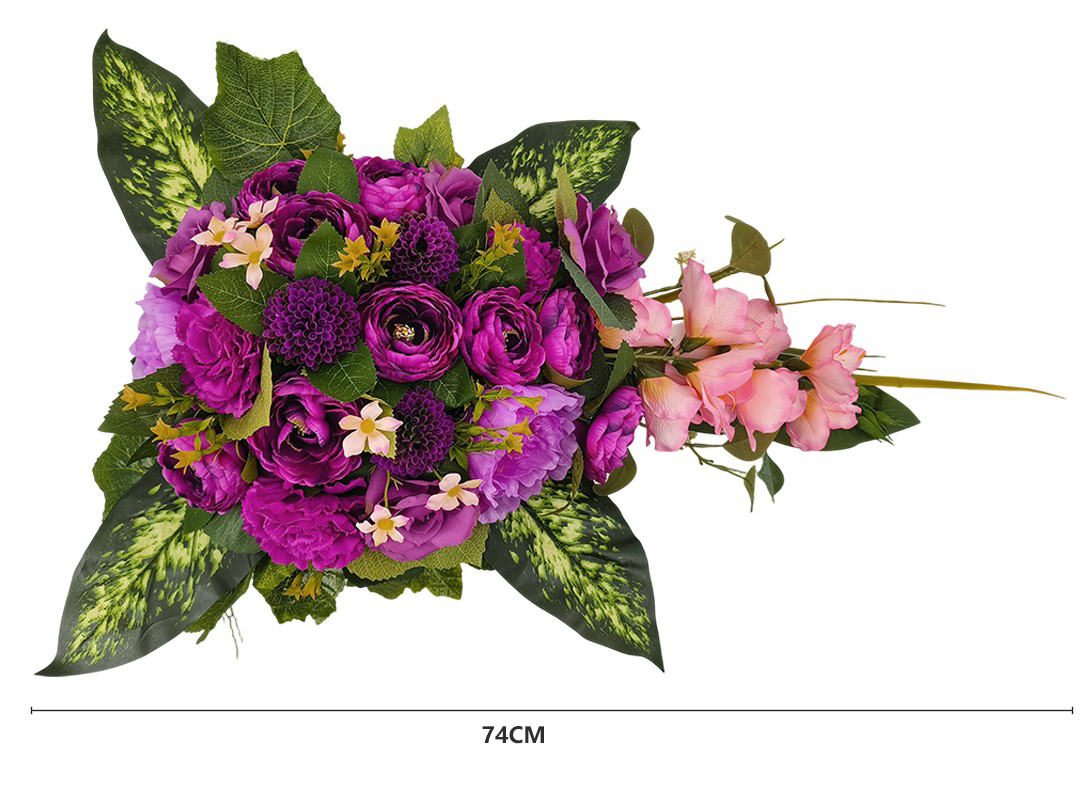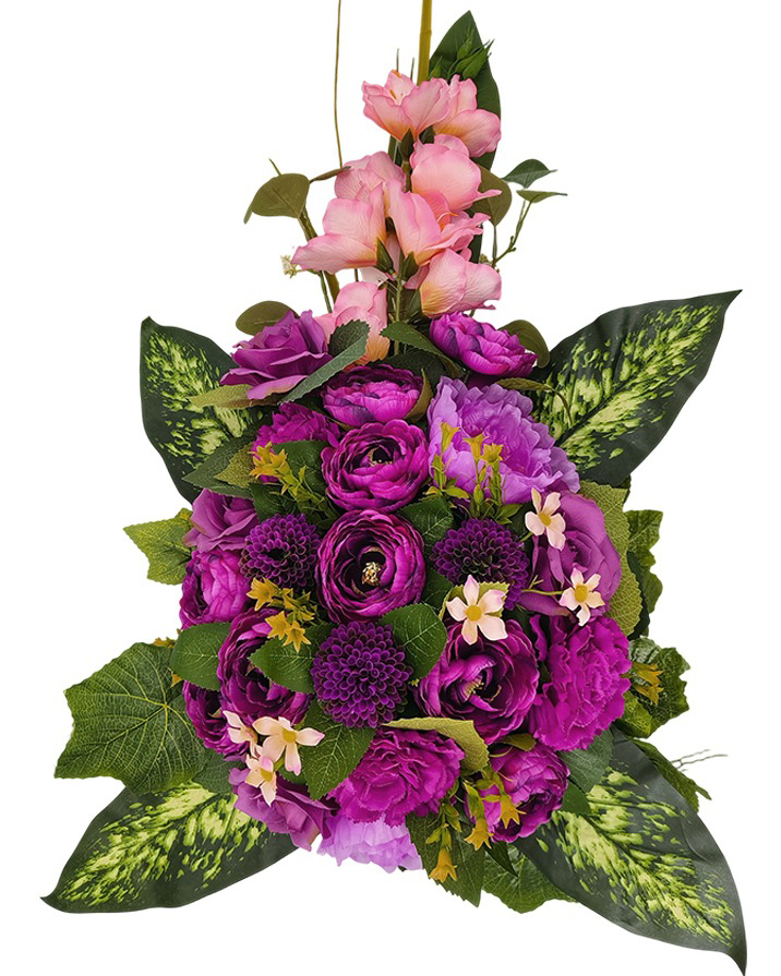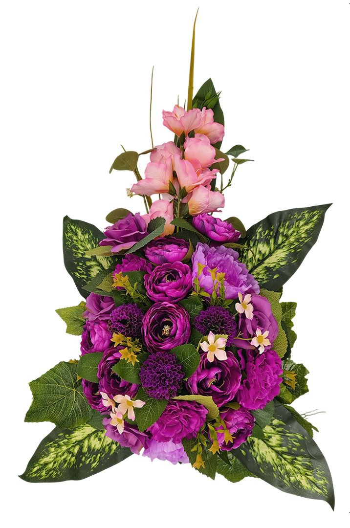 Kompozycja nagrobna z jaskrami i piwoniami o wymiarach 74 x 46 x 28 cm. Trwała dekoracja na grób, odporna na warunki atmosferyczne, z donicą w złotym kolorze i cementowym obciążeniem. W kompozycji znajdują się jaskry, piwonie, róże, dalie, mieczyk, eukaliptus i liście diffenbachii. Model w kolorystyce fioletu, purpury i różu.