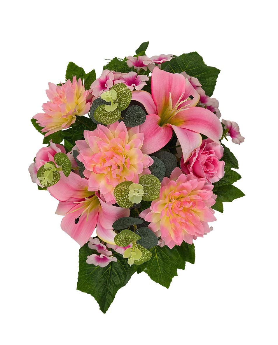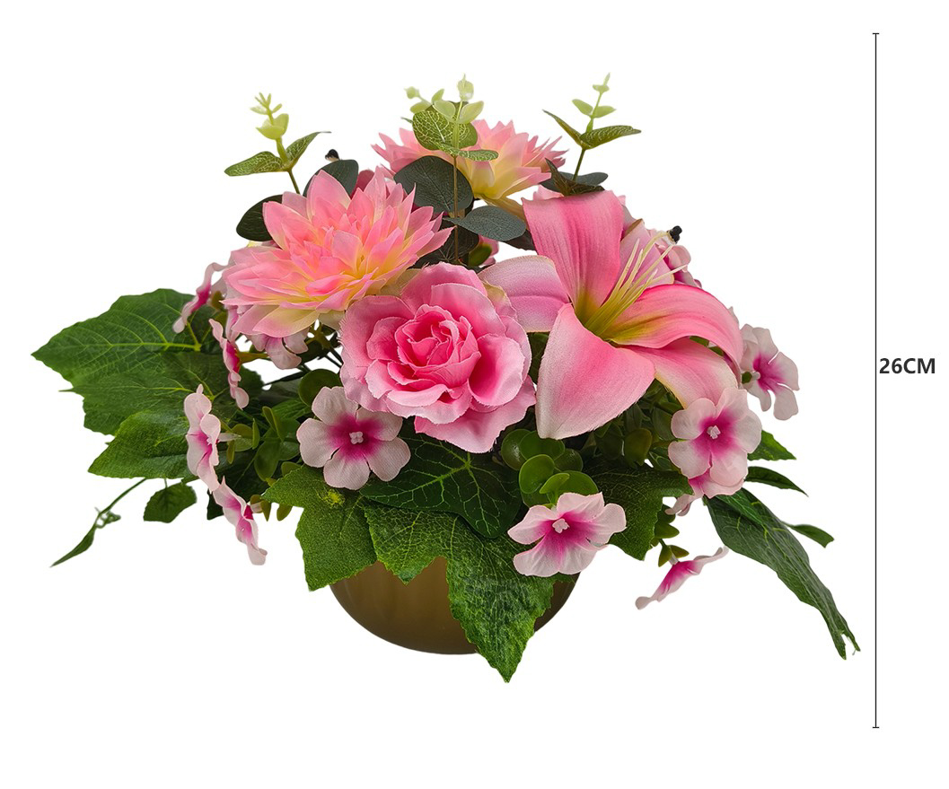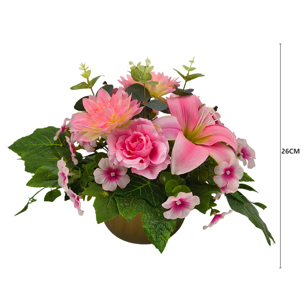 Kompozycja nagrobna z liliami i daliami w złotej donicy 45 cm to rozbudowana dekoracja na grób, która łączy większe kwiaty z zielonymi dodatkami. Została osadzona w złotej donicy z obciążeniem, dzięki czemu jest gotowa do ustawienia i stabilnie stoi na nagrobku. Różowa kolorystyka nadaje całości spójny, dekoracyjny wygląd.