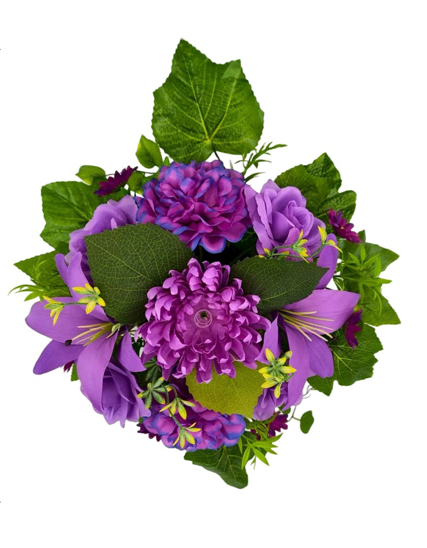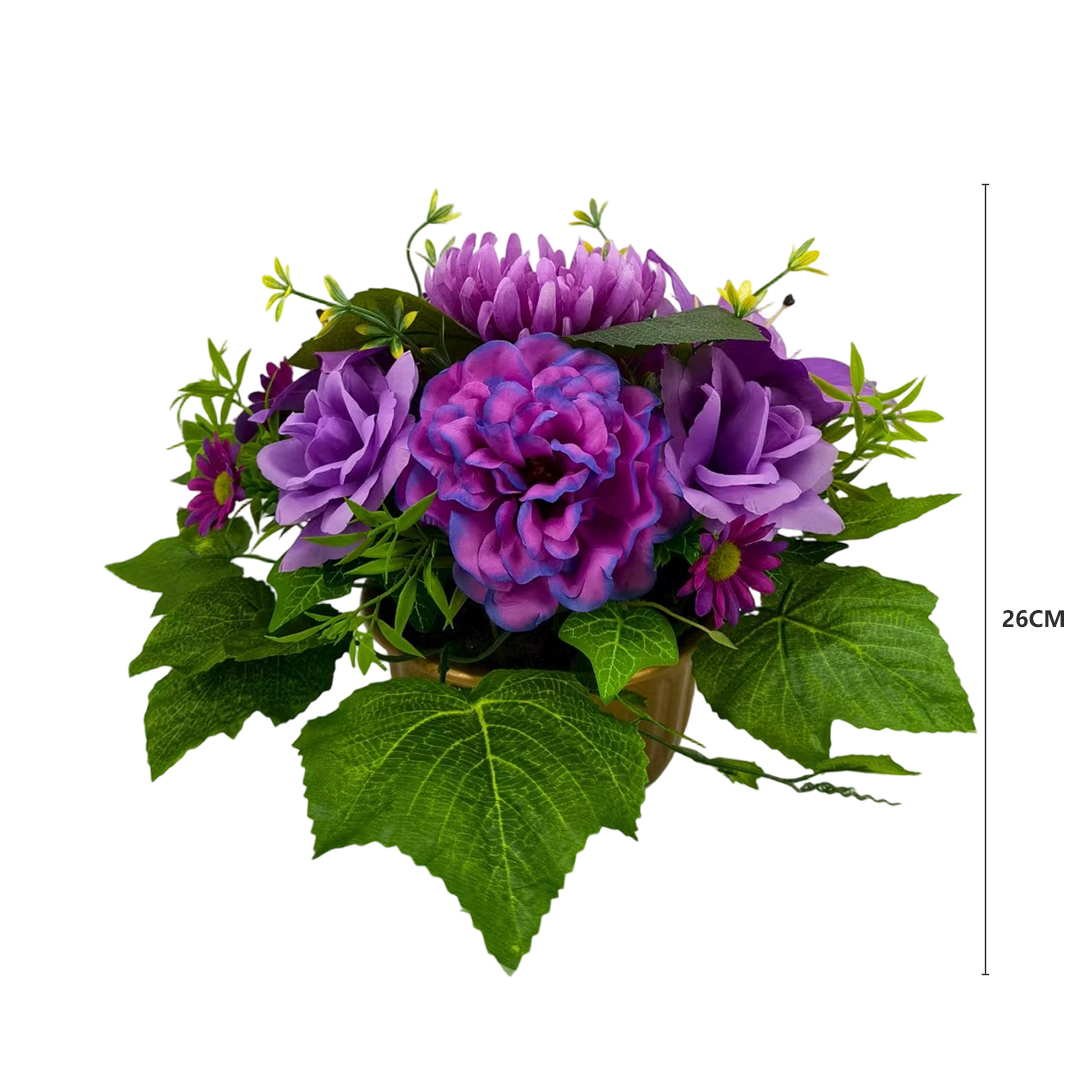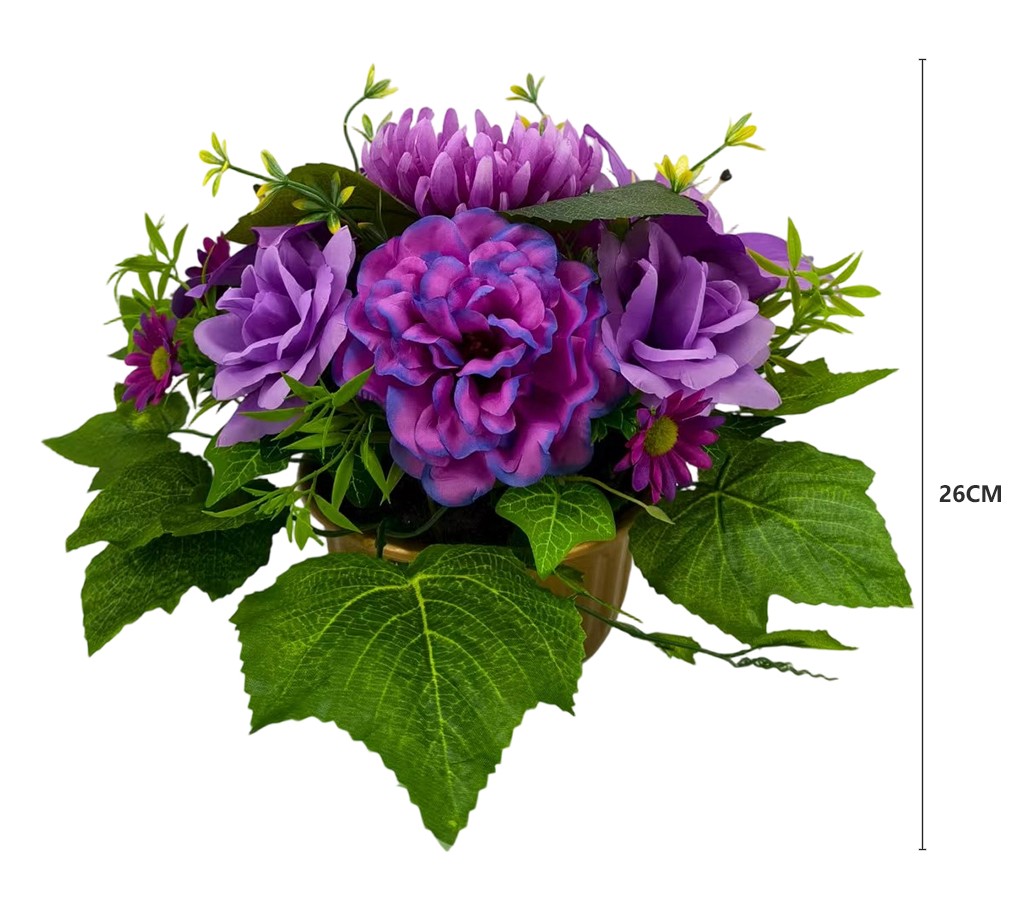 Kompozycja nagrobna z różami i liliami w złotej donicy 45 cm to dekoracja na grób o bardziej rozbudowanej formie, która dobrze prezentuje się na nagrobku dzięki starannie dobranym kwiatom i zielonym dodatkom. Została osadzona w złotej donicy z obciążeniem, dlatego jest gotowa do ustawienia i stabilnie stoi na płycie. To propozycja dla osób, które szukają wyraźniejszej ozdoby na cmentarz w jednolitej, fioletowej kolorystyce.