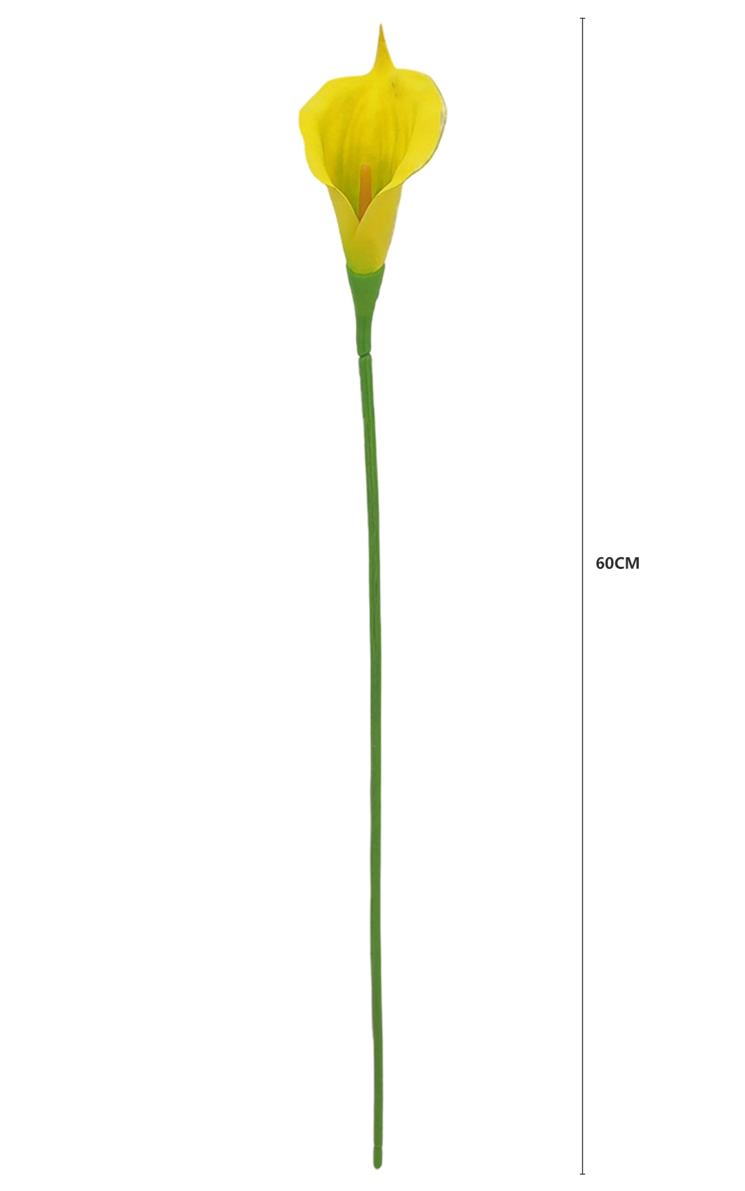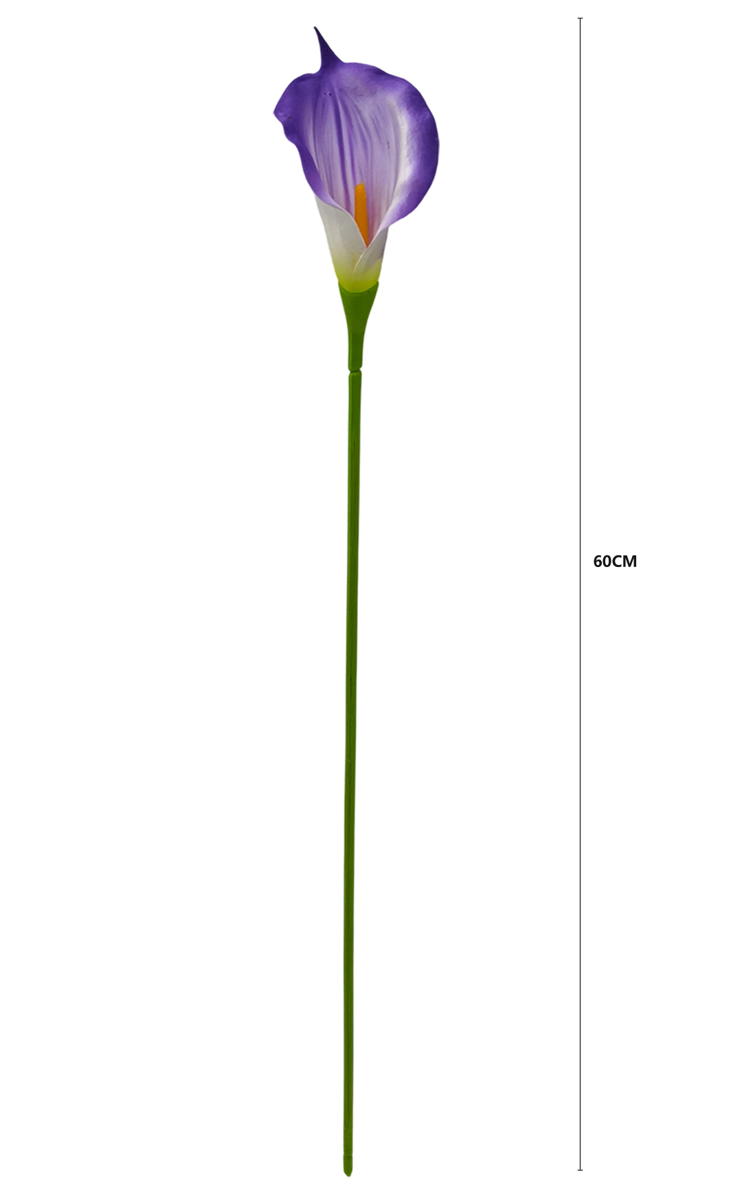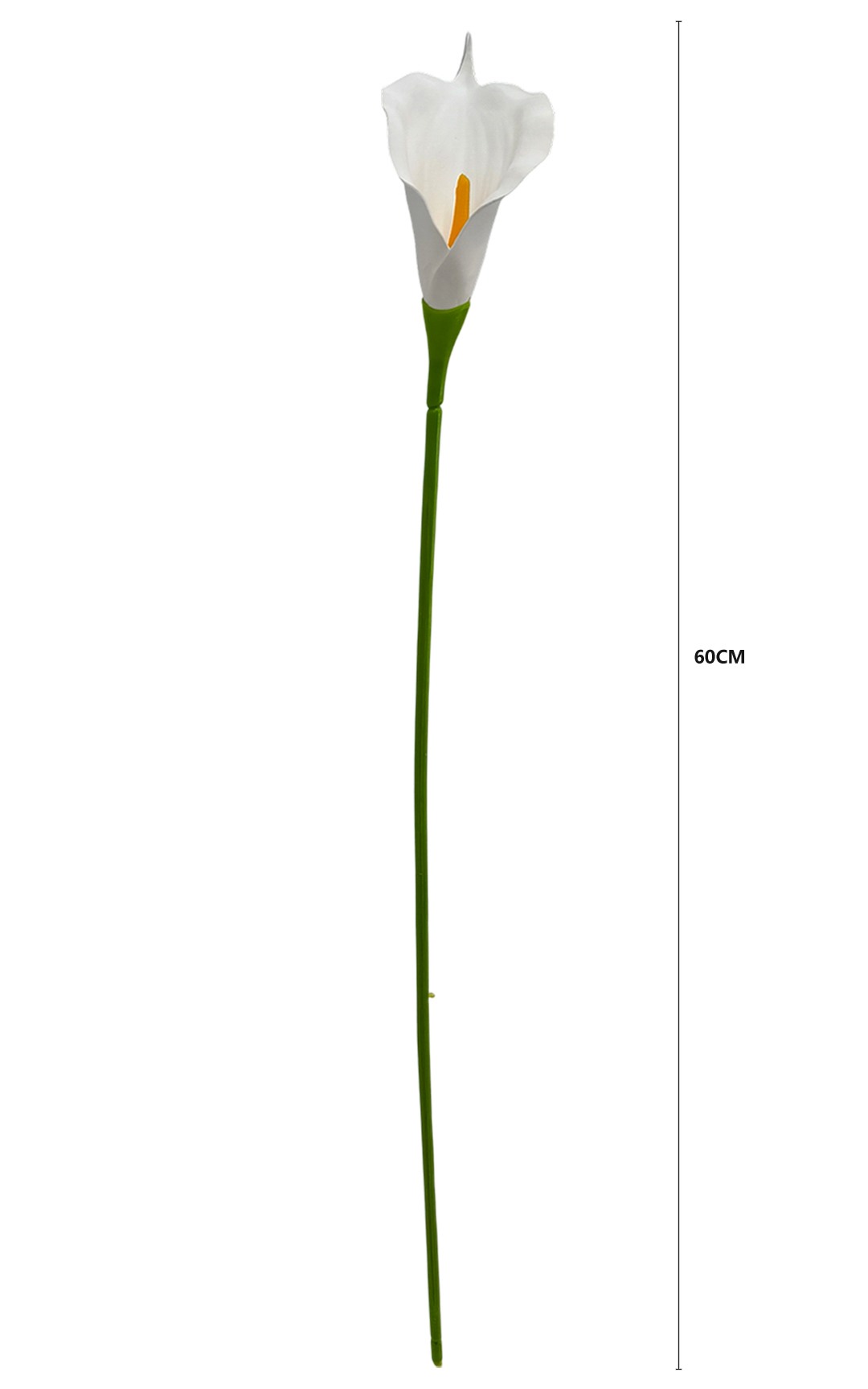 Wprowadź do swojego wnętrza nutę elegancji i prostoty z sztuczną kalią o wysokości 60 cm. Ten piękny, pojedynczy kwiat zachwyca naturalnym wyglądem, delikatnie wygiętym kielichem i głębokim kolorem, który wiernie odwzorowuje prawdziwą kalię.